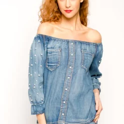 Best Pirce 🛒 CY Boutique Off Shoulder Top With Pearl Embellishments In Denim ⭐