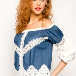 Deals 😉 CY Boutique Off Shoulder Crop Top With Lace Detail In Navy Blue Denim 🎁