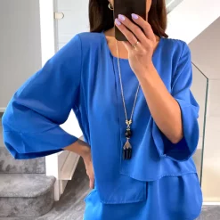 Top 10 💯 HOXTON GAL Oversized 3/4 Sleeves Asymmetric Layered Blouse With Necklace In Indigo 💯