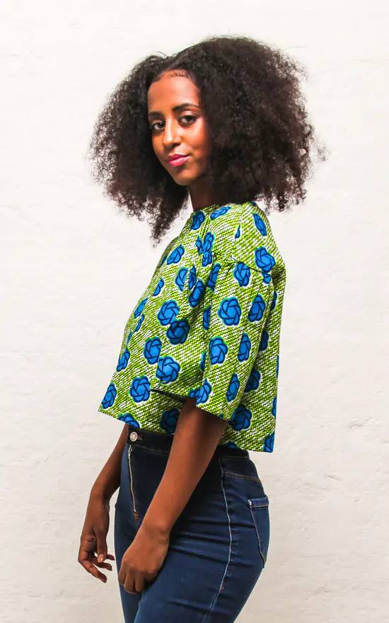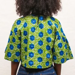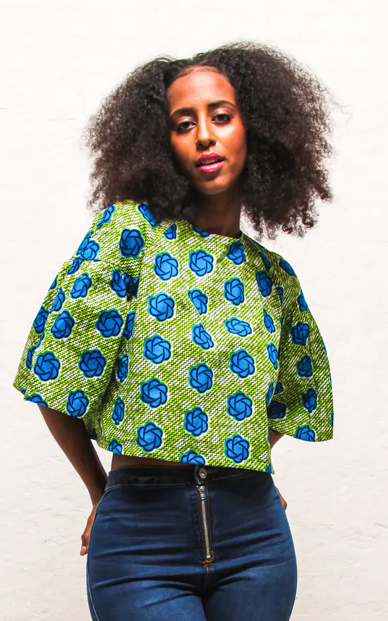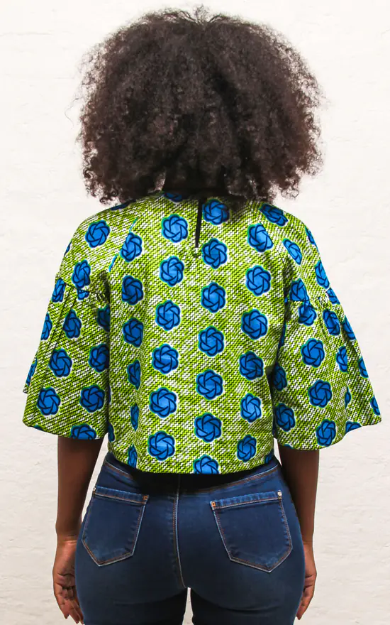 The Teni Top is a cropped short sleeved boxy top in a green and blue floral print. Be set apart from the crowd with the slightly dramatic flared sleeves. It sits perfectly on the waist and has a cute buttonhole detail at the back. This style is made from a floral African print fabric and goes nicely with a pair of fitted jeans.