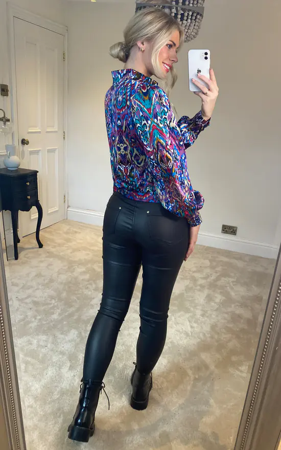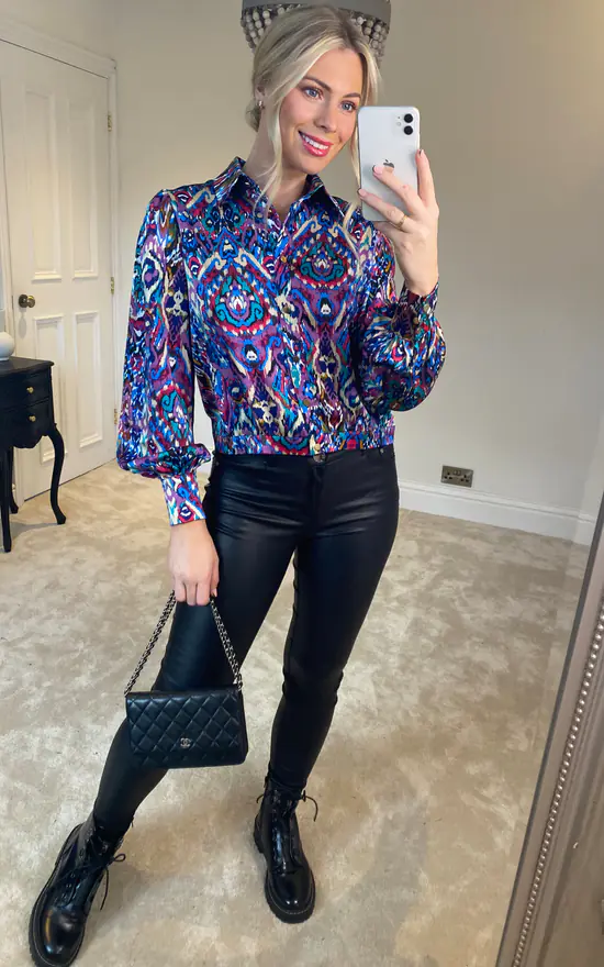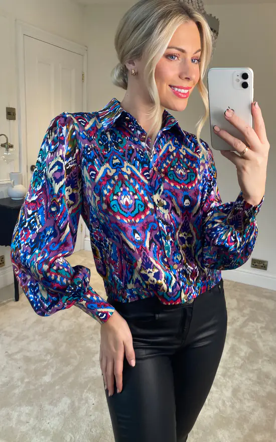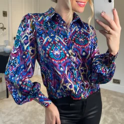 The Long Sleeve Buttoned Satin Shirt in Chic Boho Print by AngeleyeΒ is so stunning thanks to the ornate print and the glossy silk-satin fabric! Coming in a new chic print featuring wide cuffs and gold buttons throughout. Match with a pair of trendy leather trousers or your favourite jeans to complete your look.