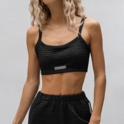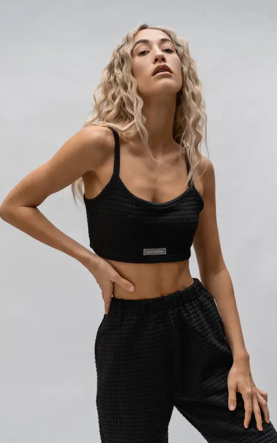 Fitted crop tank top with thin straps giving it a delicate feminine look. Feel a subtle pop of texture in this quilted waffle like fabric. The stretchy thick fabric is used with ultimate support in mind.