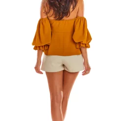 Spanish style blouse. The neckline in the heart beautifully exposes the shoulders. Sleeves add character. At the front of the neckline, attention is drawn by wrinkling and binding. The bottom of the blouse is loose with a trapezoidal cut. Blouse made of flowing fabric. Perfect for summer.