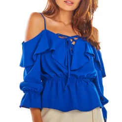Spanish style blouse. Binding at the neckline and valance add charm. The binding at the neckline can be adjusted, so the blouse fits any figure. Open shoulders and sleeves ΒΎ in a non-obvious way expose the virtues of femininity. Elastic waist exposes the waist. An absolute must have of the season. Looks great with shorts. Also fits cigarillos.