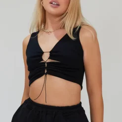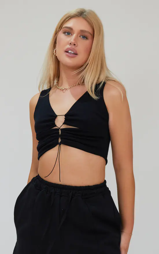 This sleek, body hugging crop top is made to perfection. The bodycon cut with adjustable ties makes this a dream summer top for any occasion. The cut-out middle adds new style, yet it stays a timeless top you can wear over and over again. The double lined top gives you the confidence to feel secure no matter the occasion. Team it up with our straight joggers for a chilled vibe, or dress it up for the ultimate day to night look. Comes in colours: grey, white, black and navy