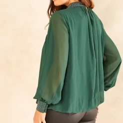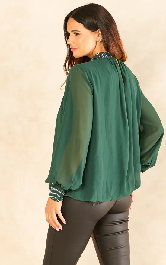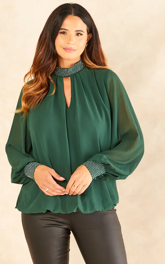 Is it your wish to look elegant this season? Blue Vanilla’s Diamante Collar & Cuff Puffball Top is here for you! This is a high neck top, with front and back keyholes, and diamond details on the collar and cuffs. Matched with a midi skirt and ankle boots, this top is perfect for a date night.