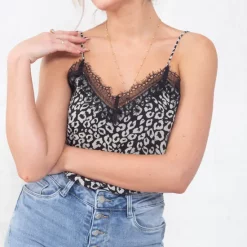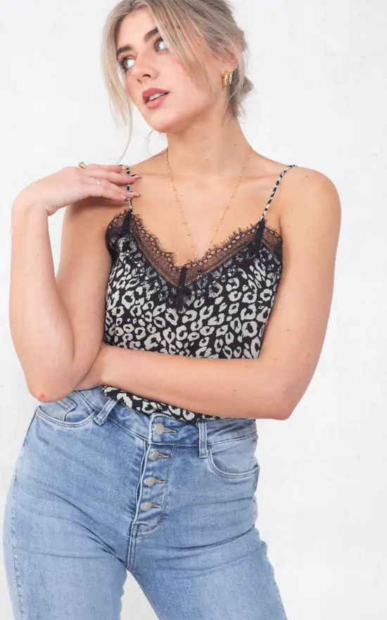 Our Black Leopard Print Lace Trim Cami Top is part of our latest Tops collection. Featuring a thin, lightweight material in a leopard print with a v neckline , lace trim and strappy design.