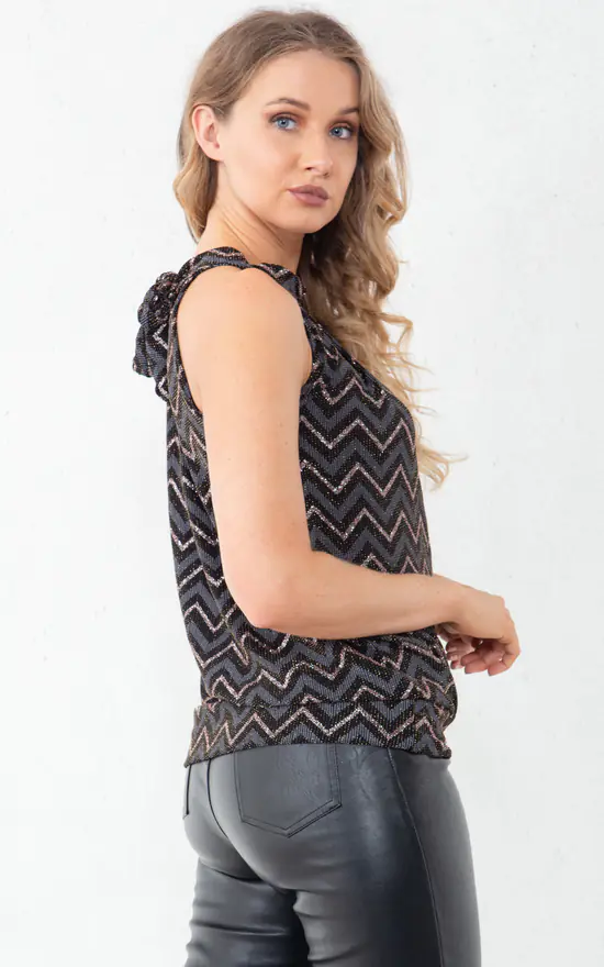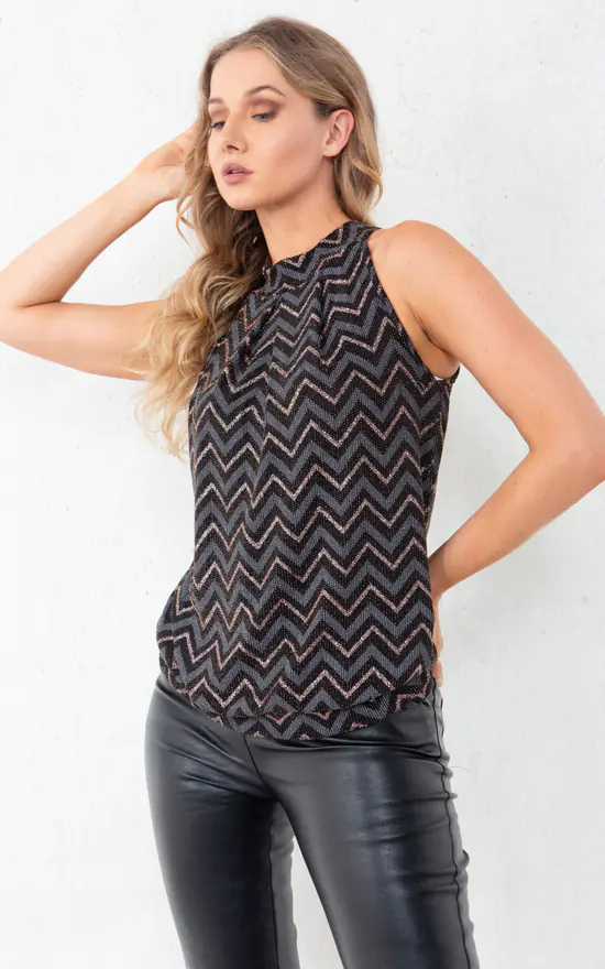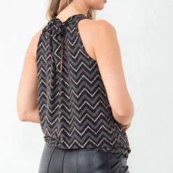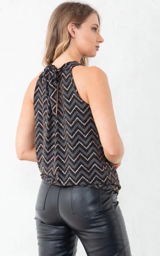 Our Glitter Knitted Chevron Design Tank Top is part of our latest Tops collection. Featuring a glitter knitted material in a chevron design, a high halter neck, back neck tie, and sleeveless design.