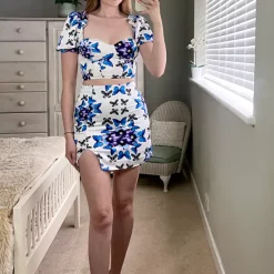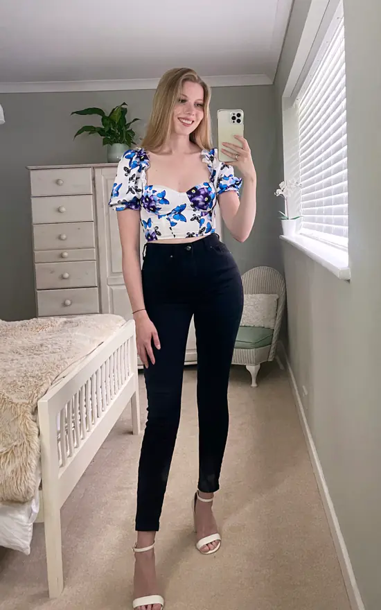 Another crop top you need, designed with its sweetheart neckline, delicate puff sleeve shoulders and structured bodice hugging your figure for that perfect flattering fit. Whilst the shaped cups, ruffled sleeve edge and hand drawn bespoke print complete the look. Take the top to the next level by pairing it with the matching skirt or alternatively pair with a leather jacket and cute hat to bring it into the winter season.