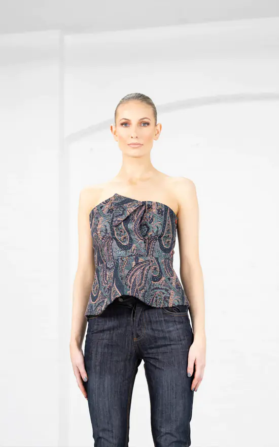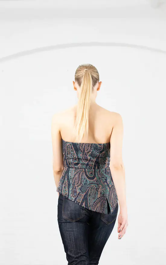 Fitted corset top (Metallic Black). Peplum feature with two part centre front, fold over detail with boning. This top has a left sided invisible zip.
