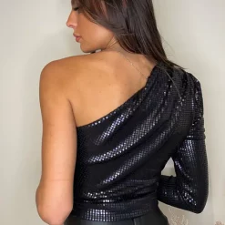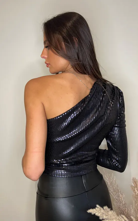 One Shoulder Long sleeve Black Sequin Top/Bodysuit is perfect occasion top for going out, party, night out, cocktails party. Sparkly Bodysuit for Christmas.