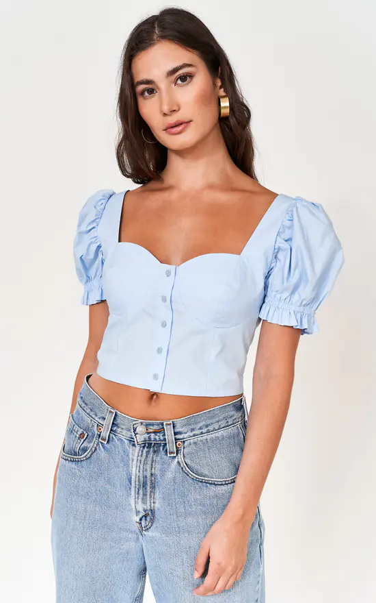 Sweetheart. This is a corset top with a sweetheart neckline in baby blue.