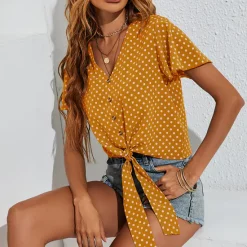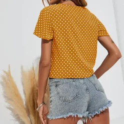 Cute Tie Knot Front Buttoned Crop T Shirt Top In Mustard Yellow & White Dot Print