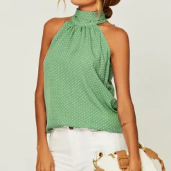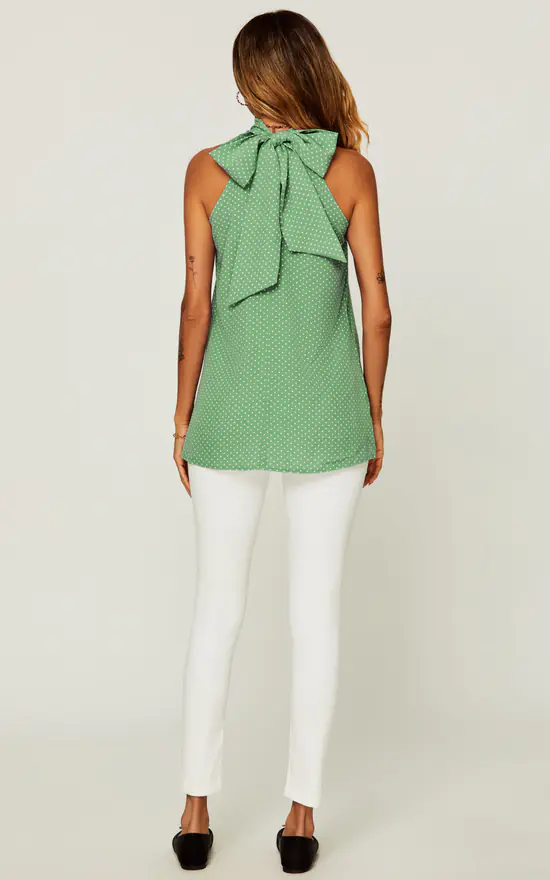 White Polka Dot Print Halter Neck Tie Back Top In Green