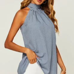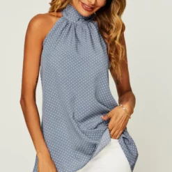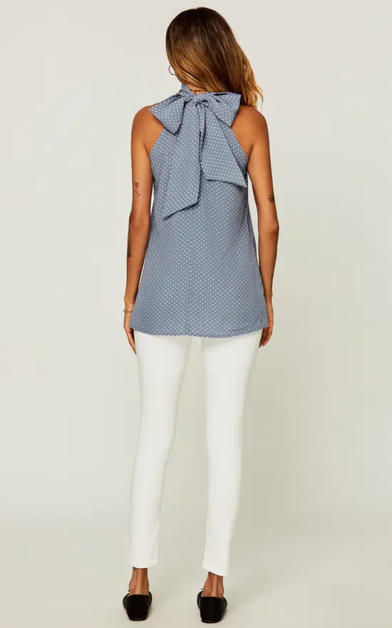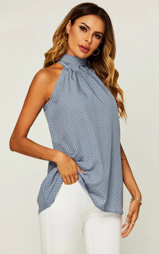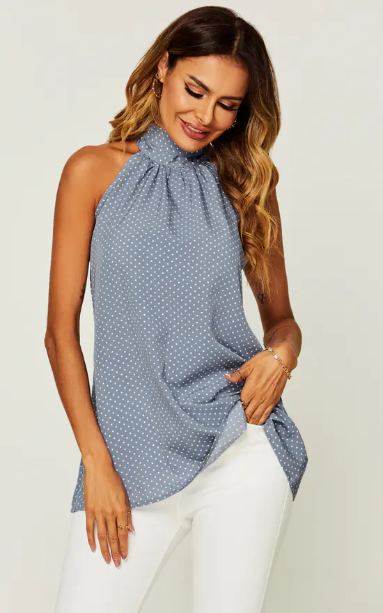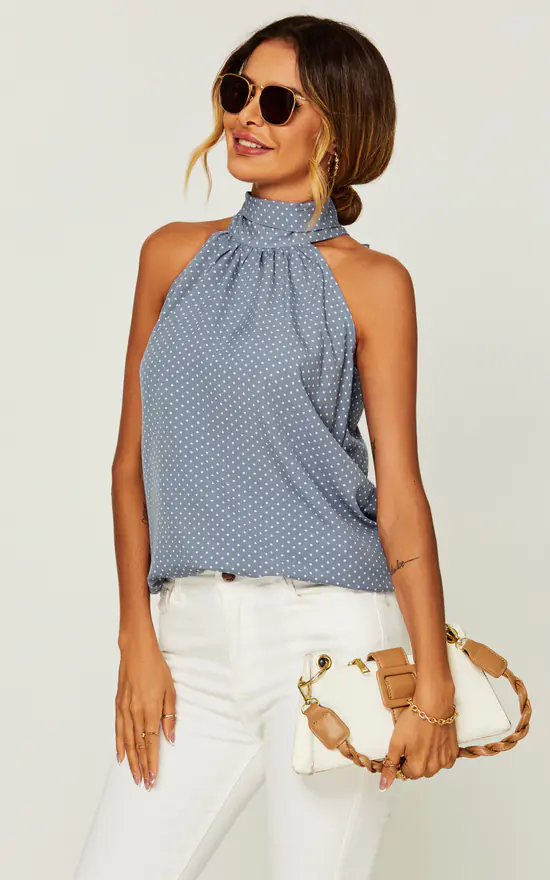 White Polka Dot Print Halter Neck Tie Back Top In Grey Blue