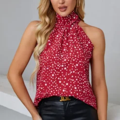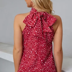 White Star Print Halter Neck Tie Back Top In Red