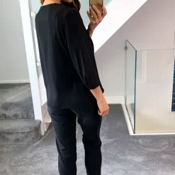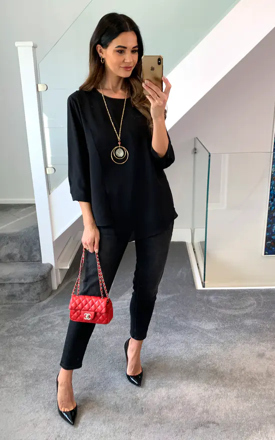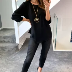 Oversized 3/4 Sleeves Layered Top with Necklace in Black features 3/4 sleeves, asymmetrical front design, a matching necklace. It is comfortable for all-day wear and can suit for all occasions and events. It is perfect for autumn day gatherings! You can dress it with trousers for an effortlessly stylish look.