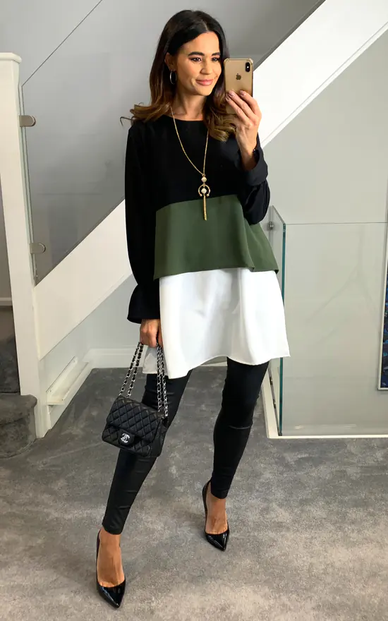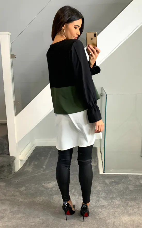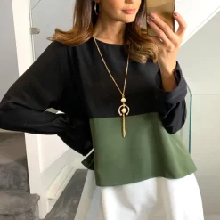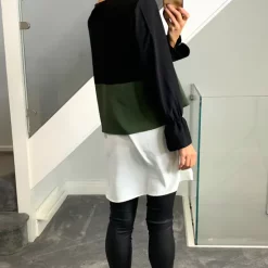 Oversized Colour Block Top in Black, Green and White with cute color transitions takes you out from monotone, regular look. You can feel very comfy with this piece in long days. It can be combined with jeans and basic shoes.