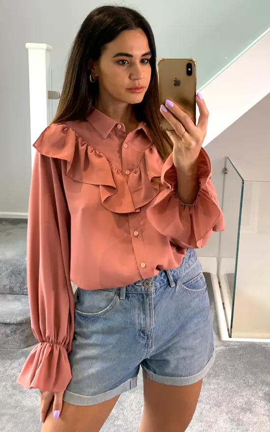 Deals ๐Ÿ”ฅ HOXTON GAL Oversized Frilled Front ๐Ÿ‘• Shirt With Detailed Cuffs In Pink ๐Ÿ””