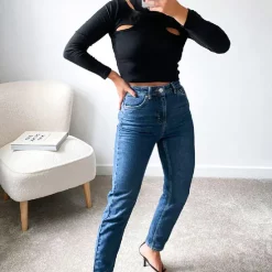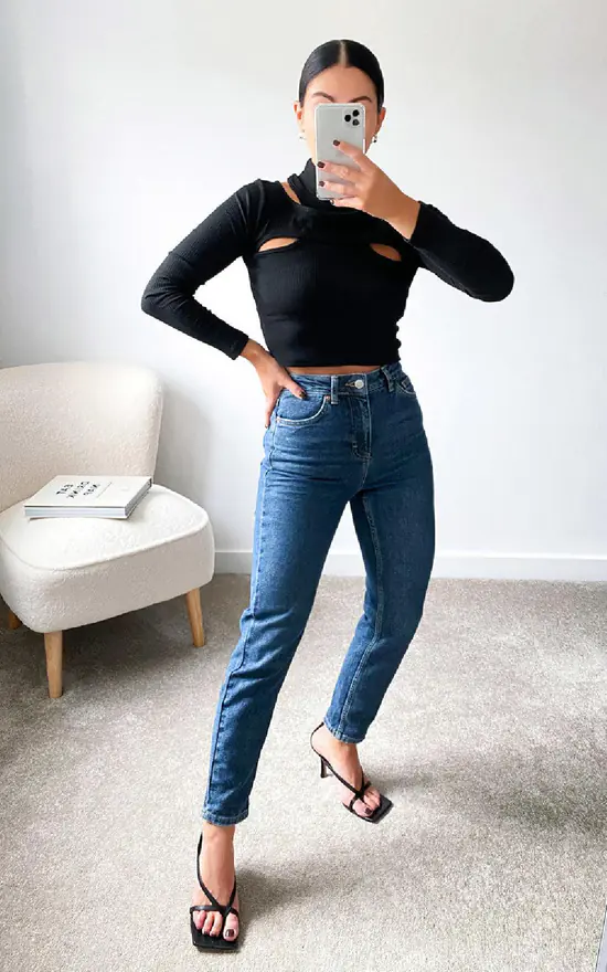 our RAZZI top features all over ribbed material, high neckline with cut out detailing and cropped length. Style with leather look leggings or mom style jeans and dress up or down depending on the occasion.