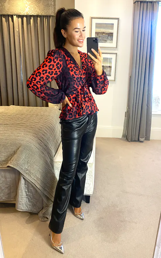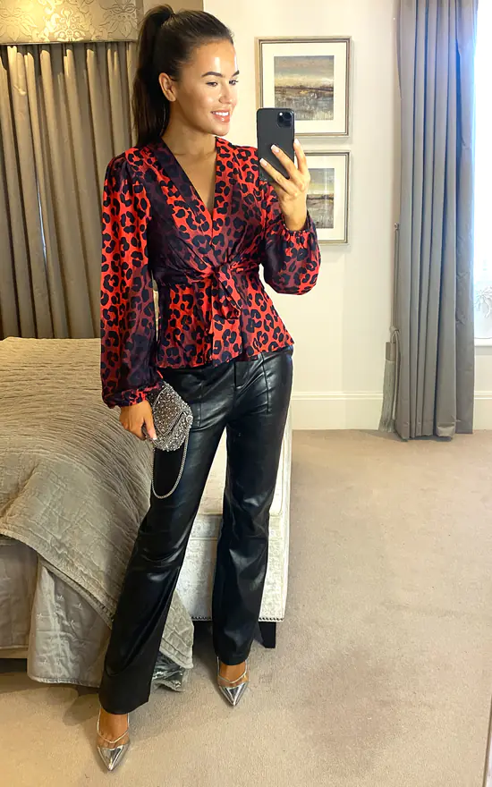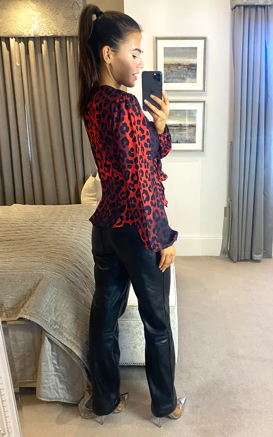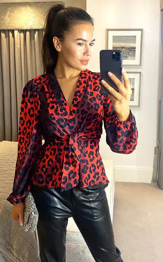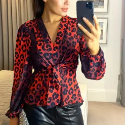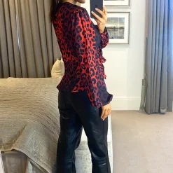 Long sleeve Wrap over style Blouse in Red Leopard print. 2 variants of wearing: wrap at the front or at the back.