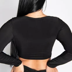 Shop our black long sleeve crop with a double knot detailing at the front. Featuring our fave slinky material that paired with flared jeans and heels will make for an insta worthy pic.