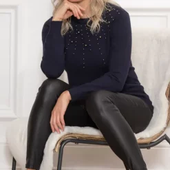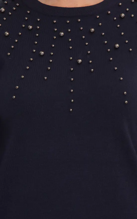Lightweight long sleeve jumper with round neckline and pearl embellishment to the front. Pair with dark wash jeans or leggings and smart shoes for a twist on smart casual. Length 68cm.