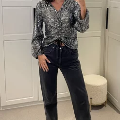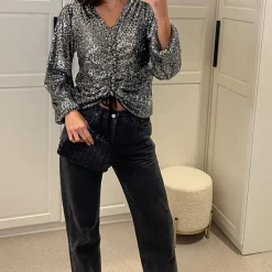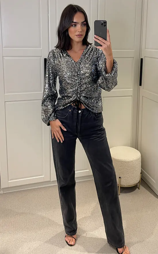 Stunning new party season arrivals! Our fully sequin, long sleeve V neck blouse features adjustable rouched tie front and elasticated cuffs. Layer with our PU leggings and boots. A luxury, top quality addition to your wardrobe! Perfect for parties and nights out.