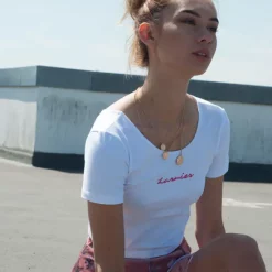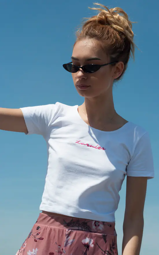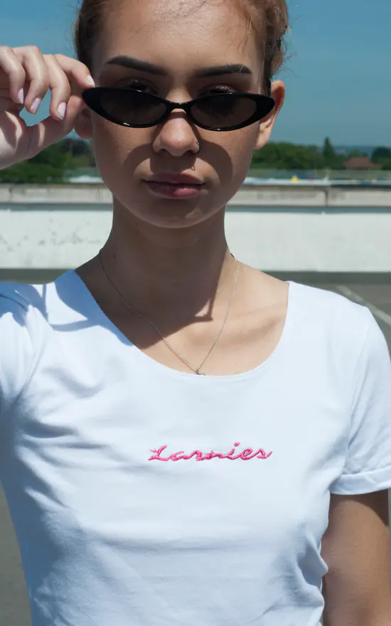 Larnies white embroidered crop The Larnies design is embroidered on a white crop top- the perfect top for festival outfits.The designs are all drawn and embroidered/printed in our Hampshire based studio!