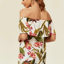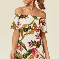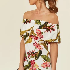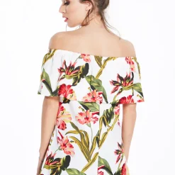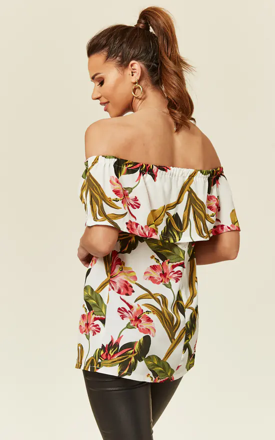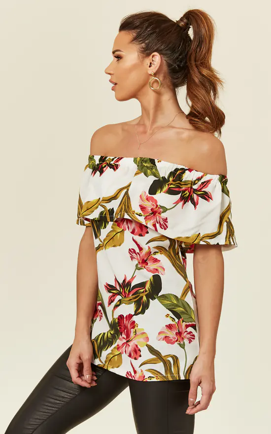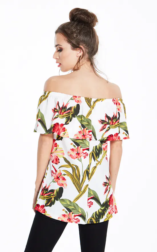 Get ready for the summer with this bright floral top in a flattering bardot shape! Perfect to wear with your shorts or jeans in the summer!