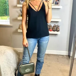 Give yourself cool look with this strappy black top with plunge neck this summer. Pair it with fit jeans and sporty shoes for perfect look. Look and feel unique with this neck design.