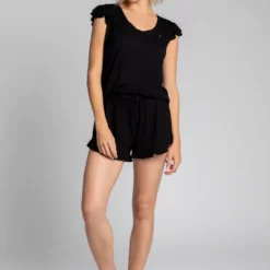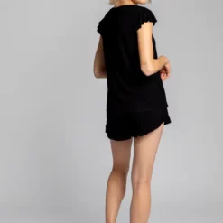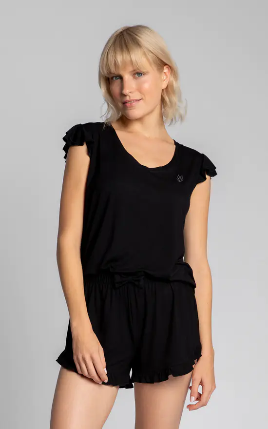 Oh my ruffles! This gentle viscose top drapes so naturally. Featuring these adorable ruffled sleeves and a decorative chest wolf logo embroidery it has been designed to flatter. It is best complemented with our viscose bottoms.
