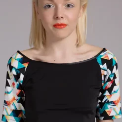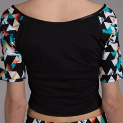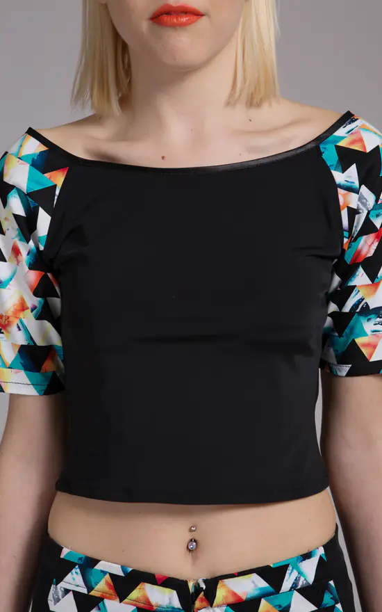The No Fixed Abode black soft stretch crop top with geometric multi-colour patterns down the short sleeves for a flattering affect.