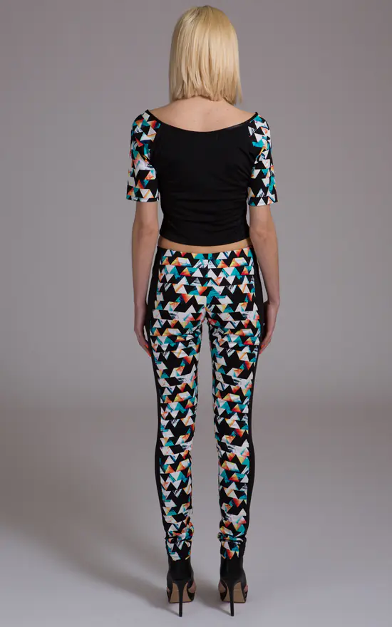 Geometric bright triangles of red, orange, green, yellow and turquoise colours. The cut is tight fitting. The latest look for cool urban city girls by day or by night.