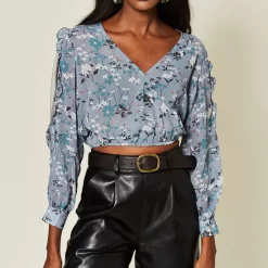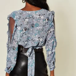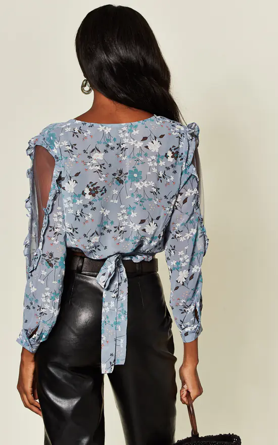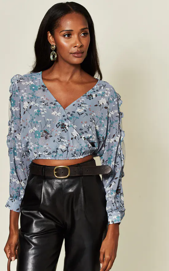 ‘Dusky Blue Floral Print V Neck Cross Over Crop Top, Ruffled Cut Out Sleeves and sheer overlay, Elasticated Hem And Detachable Belt Fastening’
