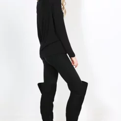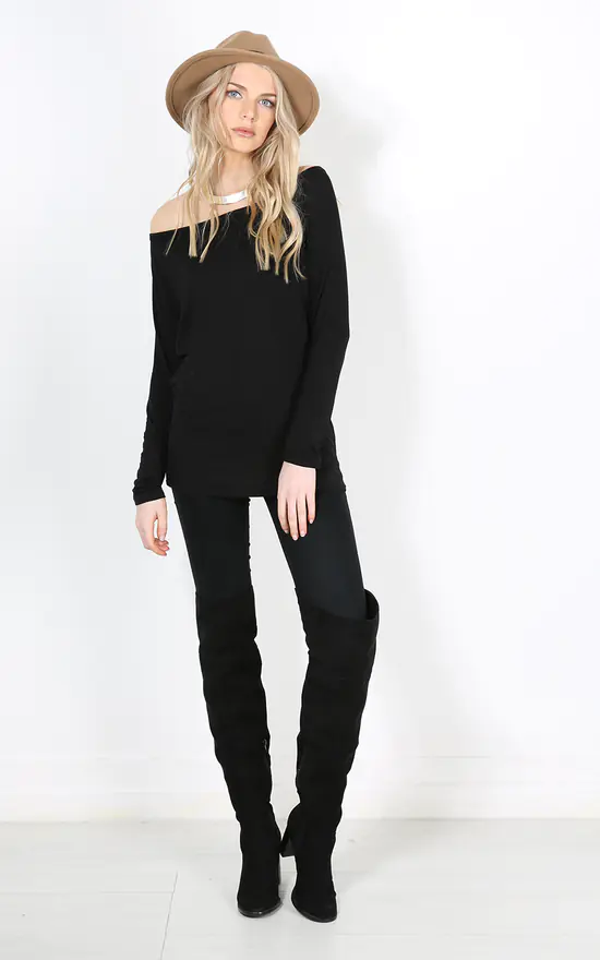 Work casual vibes in the cozy Jae Off Shoulder Long Sleeve Basic Top In Black . Featuring a bardot neckline in a super soft jersey. Wear with slim leg trousers for comfy feels.