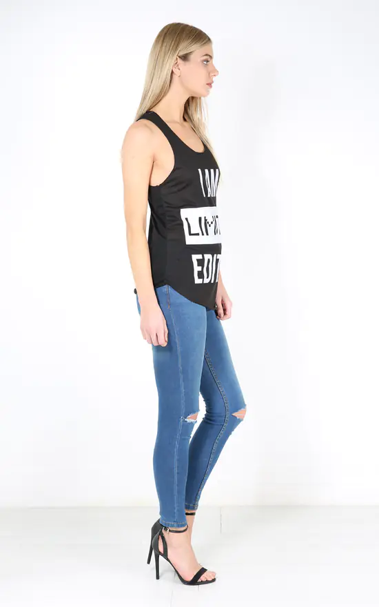 Karan I Am limited Edition Vest Top In Black! Featuring a loose fit, curved hem and slogan print, Team this with jeans and barely there for a killer day to night vibe!