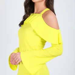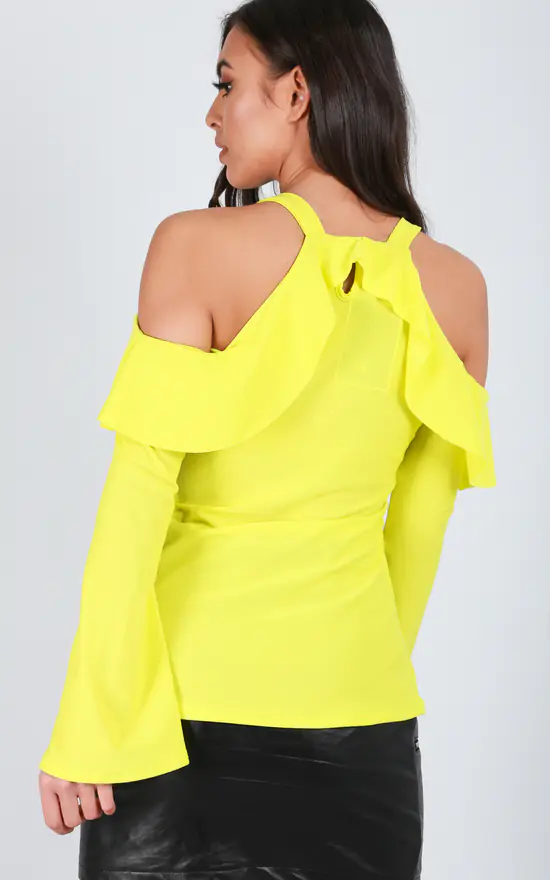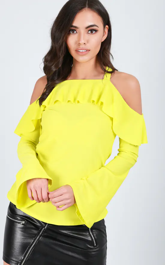 slay this season in our Brianne Flute Sleeved Top. Featuring a wrap frill front, off shoulder and flare sleeves. Keep it casual with jeans and heels or dress it up with a mini skirt and heels