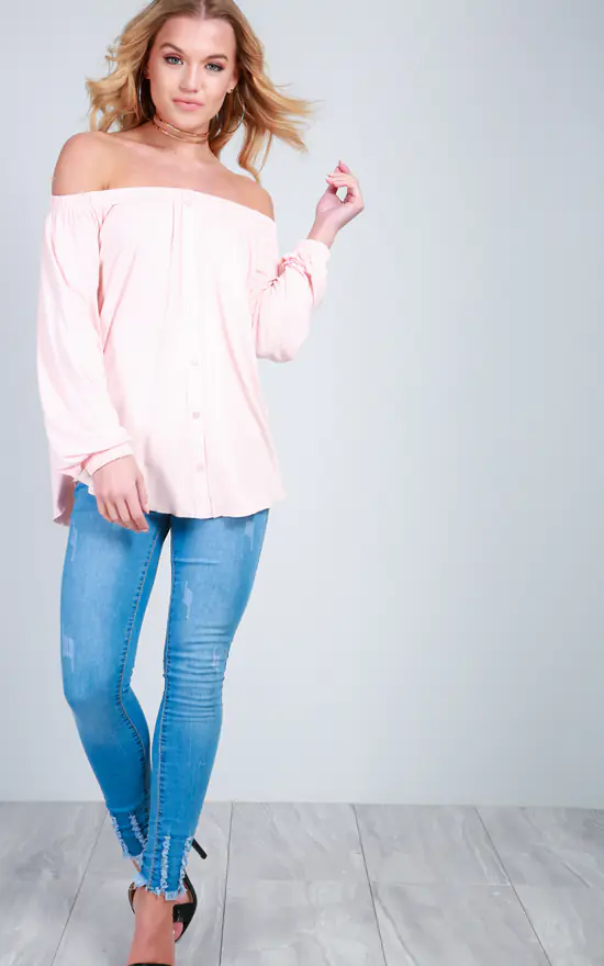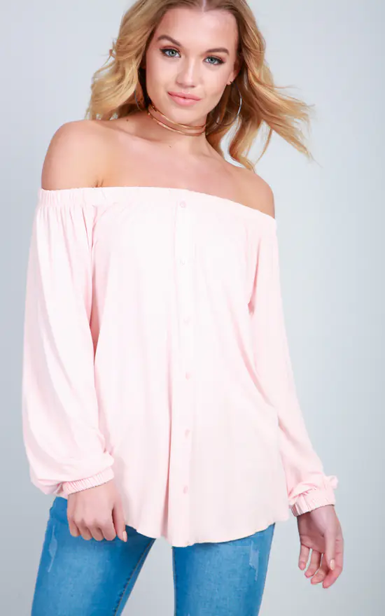 Throw som shade in this Off Shoulder Button Front Top, Featuring a cold shoulder, button down front and balloon sleeves. Wear with high waisted trousers and killa heels to complete the look.