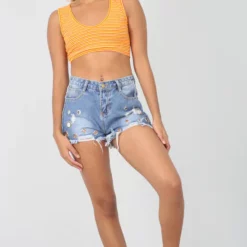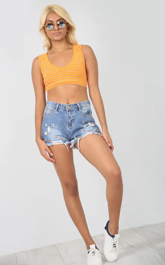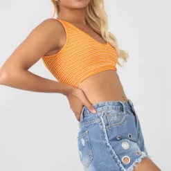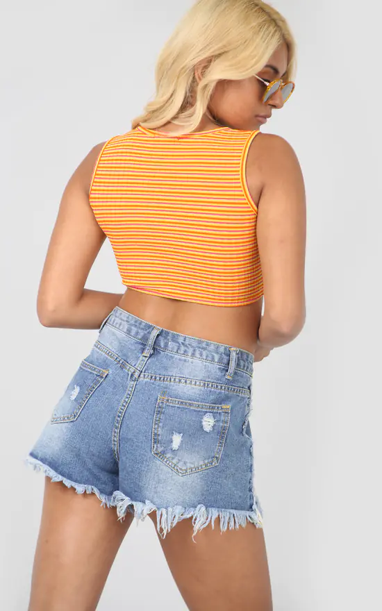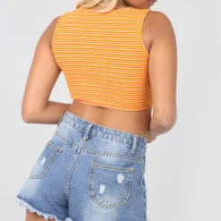 Sleeveless Neon Orange Striped Scoop Neck Crop Top! Go bold or go home! this neon orange striped crop top is the perfect statement piece to refresh your summer wardrobe!