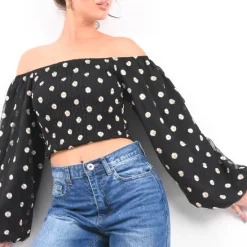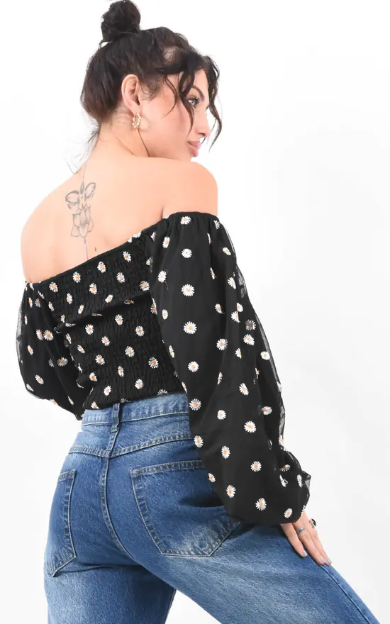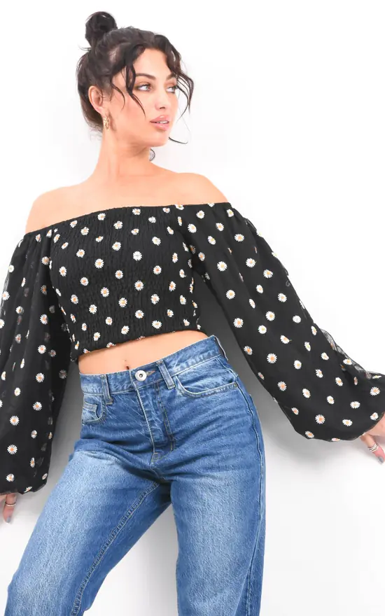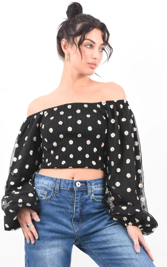 Our Black Embroidered Floral Bardot Crop Top is part of our latest Tops collection. Featuring a high quality textured ruched crop top print with embroidered flower design and long balloon mesh net sleeves.