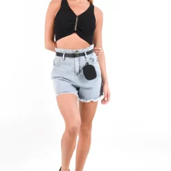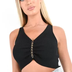 Our Black Ribbed Chain Detail Cropped Tank Top is part of our latest Tops collection. Featuring a black stretchy rib-knit material with a v neckline, gathered front, and chain detailing finished in a cropped length and sleeveless style.