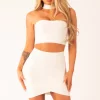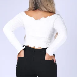 Our White Shirred Wrap Over Bardot Crop Top is part of our latest Tops collection. Featuring an off the shoulder crop top in a white ribbed shirred material with a Bardot neckline, long sleeves and lettuce frill edge detailing.