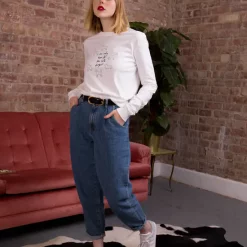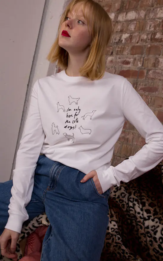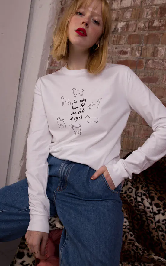 The only reason we go anywhere! This organic, white, long t-shirt comes printed with the slogan “I’m only here for the cute dogs!” surrounded by dog illustrations. the perfect gift for dog lovers! Holly is a size 8 and wears a Small. The tops are unisex and so have a relaxed, oversized fit! They are also ethically made from 100% organic cotton. Printed with sass and love in the UK XX