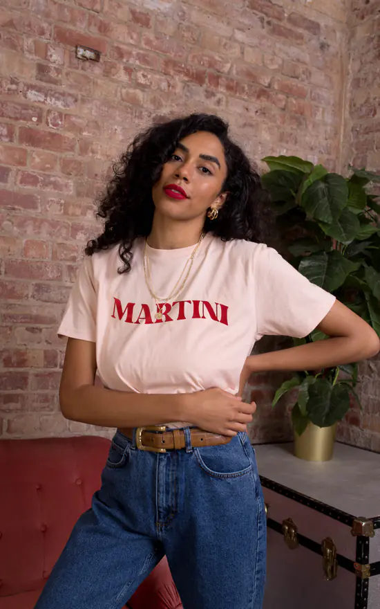 This peach t-shirt is printed with the red slogan “Martini” in a retro style font