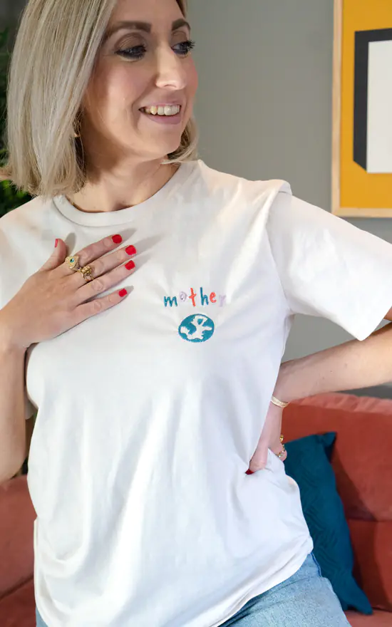 This white, organic t-shirt is embroidered on the breast pocket with the word “mother” and a planet earth illustration.
