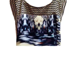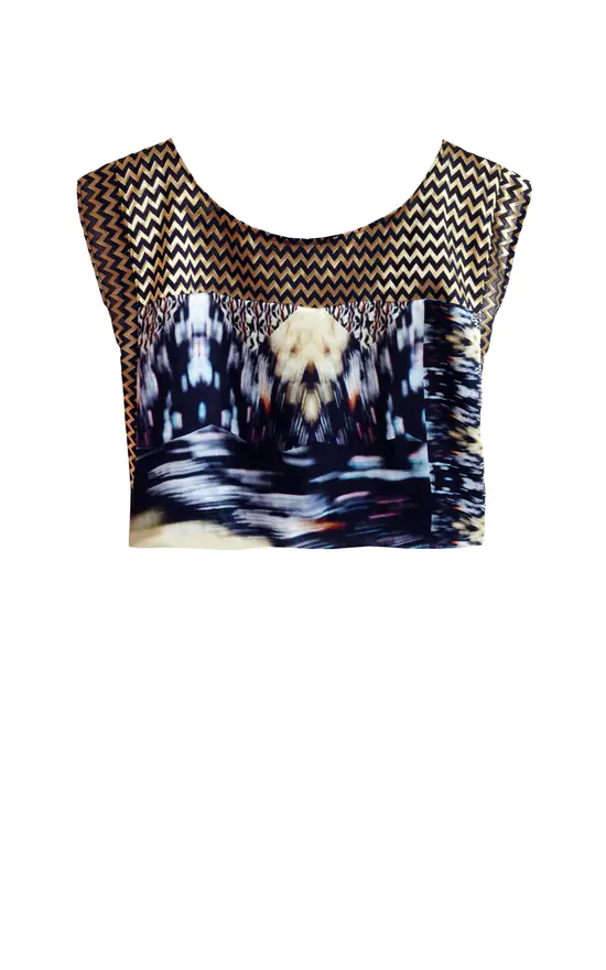 This T shirt style top features a silk satin digital print front, black duchess back and gold and black zig zag metallic jacquard top and side panels. Slightly cropped slip on, boat neckline.