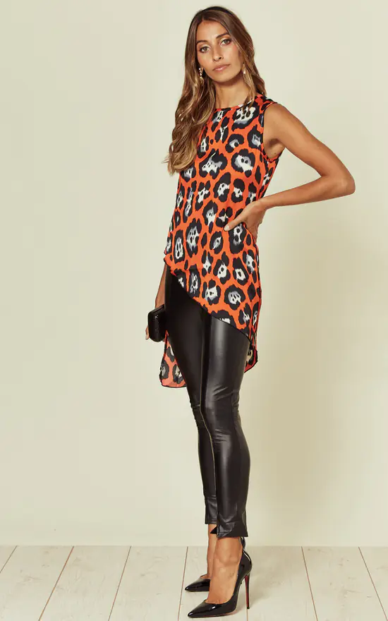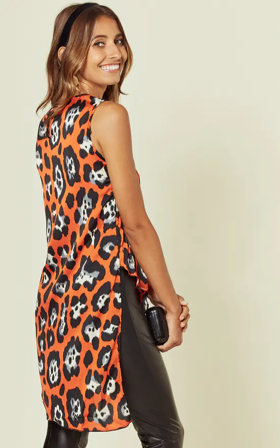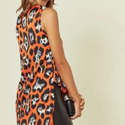 Featuring a vibrant orange leopard pattern and asymmetrical edging. Perfect for those summer nights out.