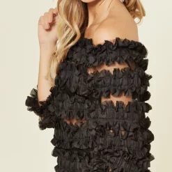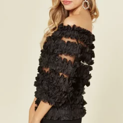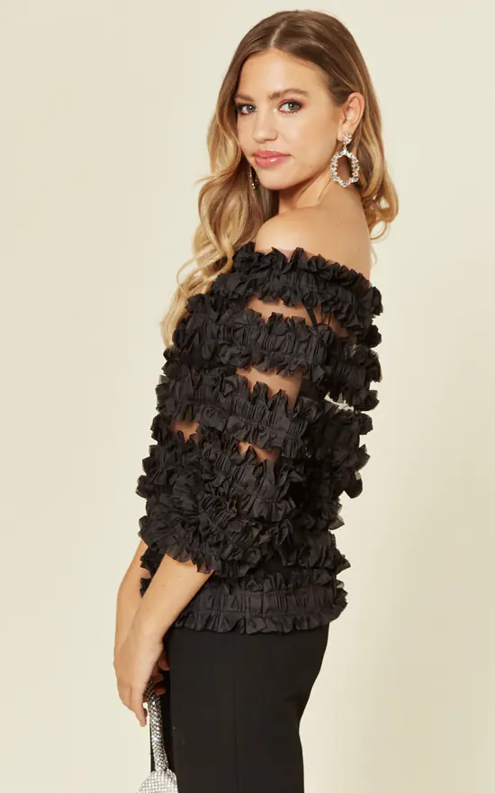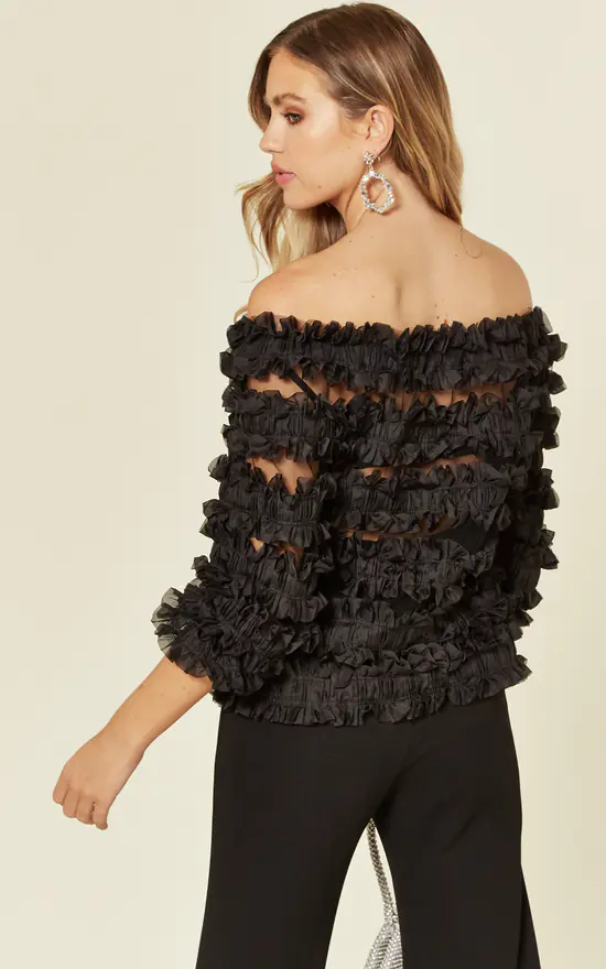 Make a statement in our gorgeous bardot frill mesh top. Perfect paired with super skinny wet look jeans sandals and an extra sassy bag for an occasion-worthy look.