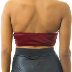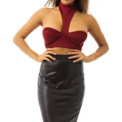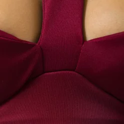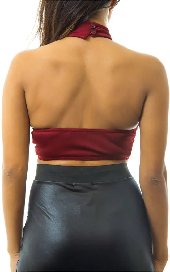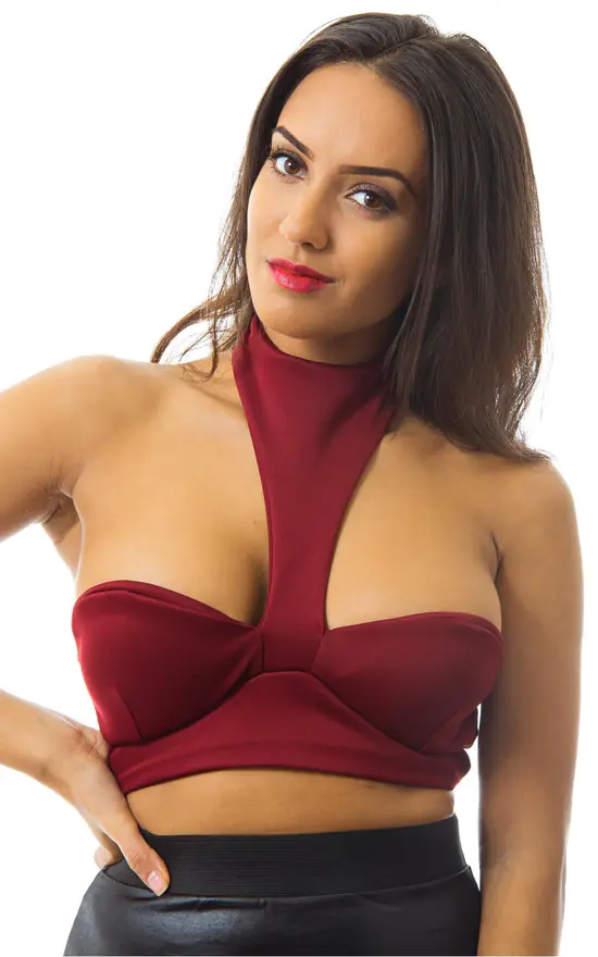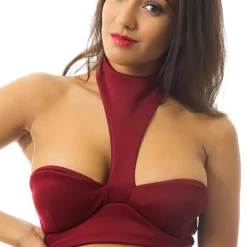 Featuring a burgundy stretch fabric, padded bust, halter neck and sweetheart neckline